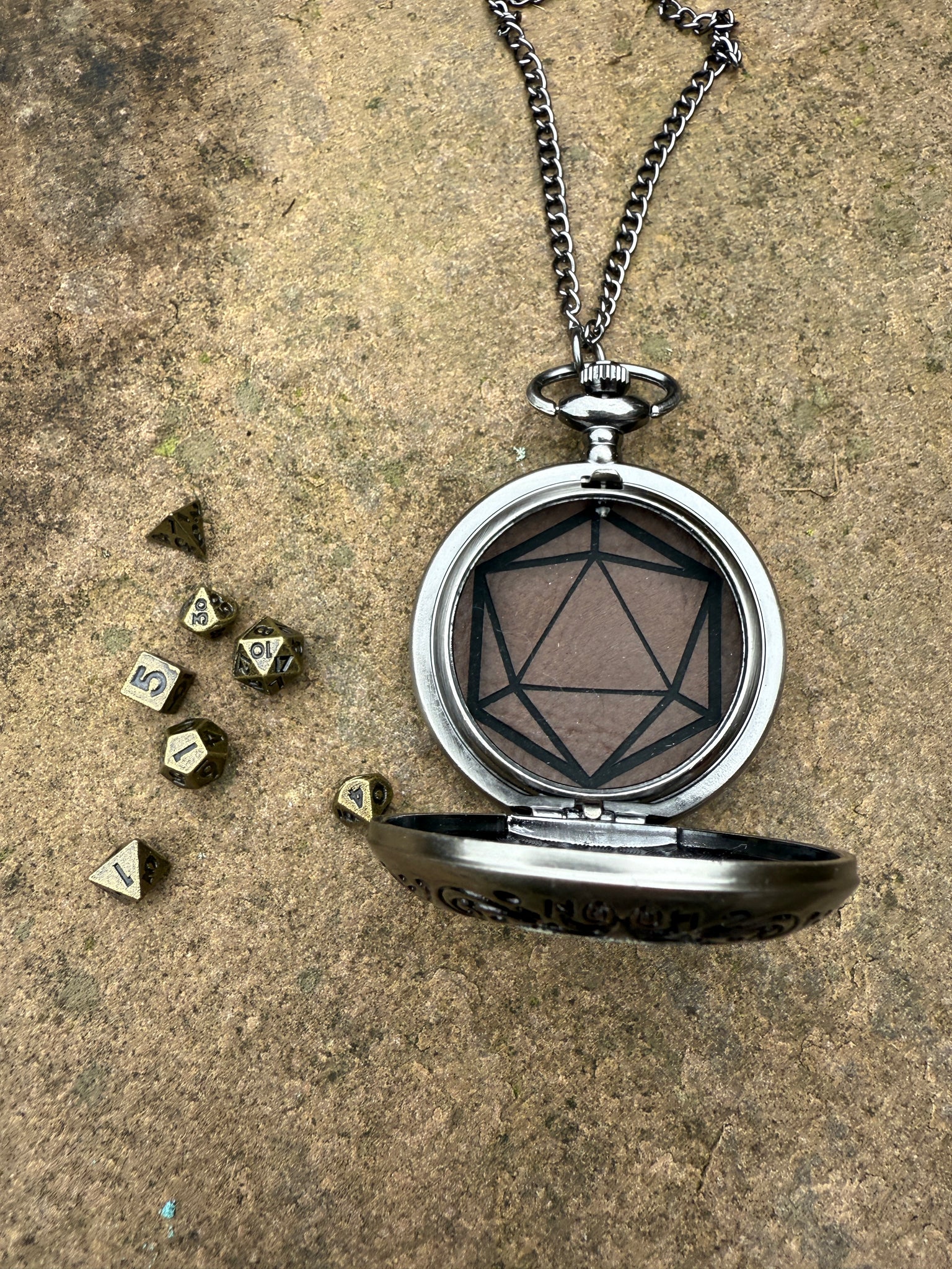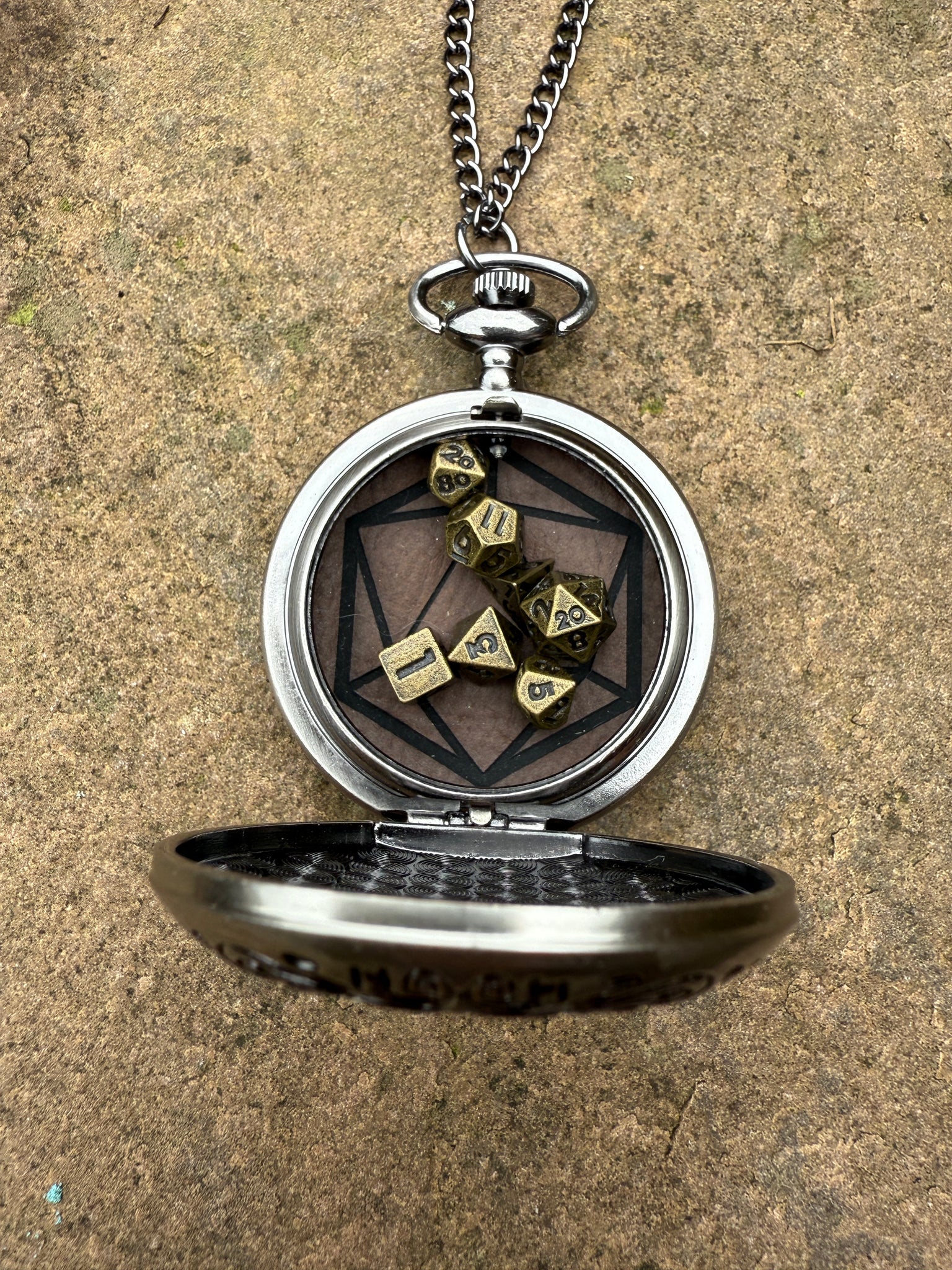 Details: The case measures about 4.8 cm across and is on a long roughly 80cm chain. Will contain a set of 7 small metal dice.