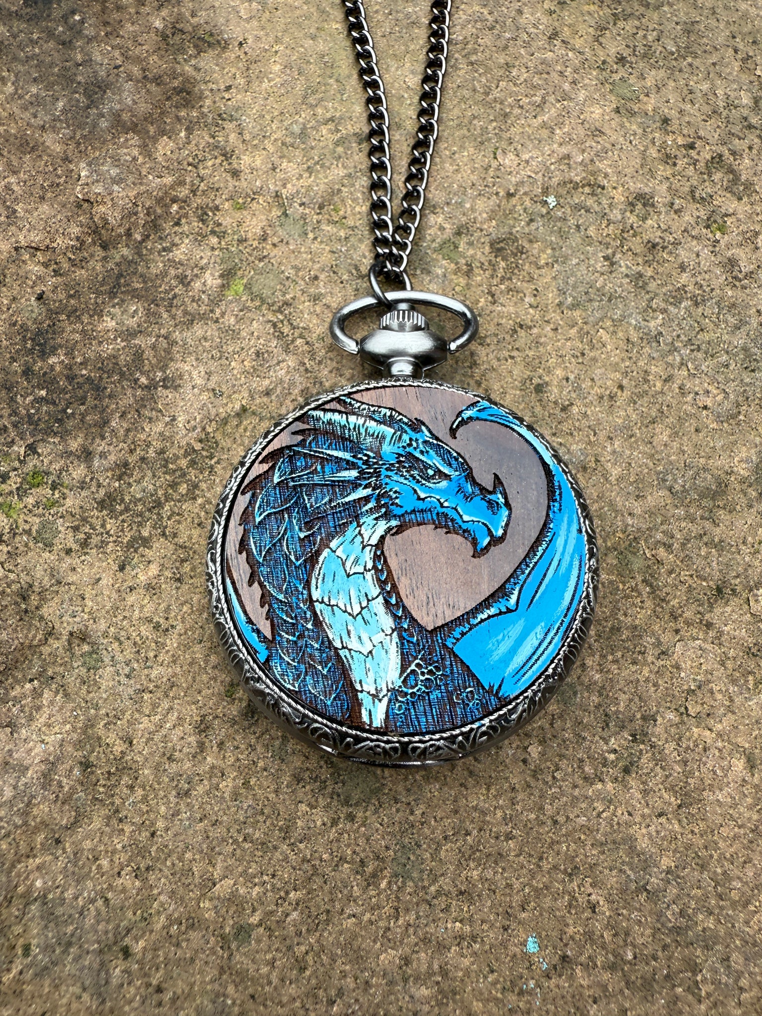 Tiny sets of dice set inside pocket watch style cases with our dragon design engraved on the front. They are carefully hand painted to bring the design to life and covered with a glossy sealer.