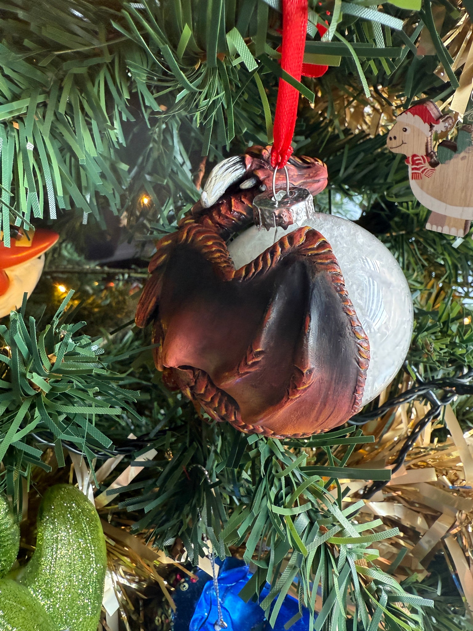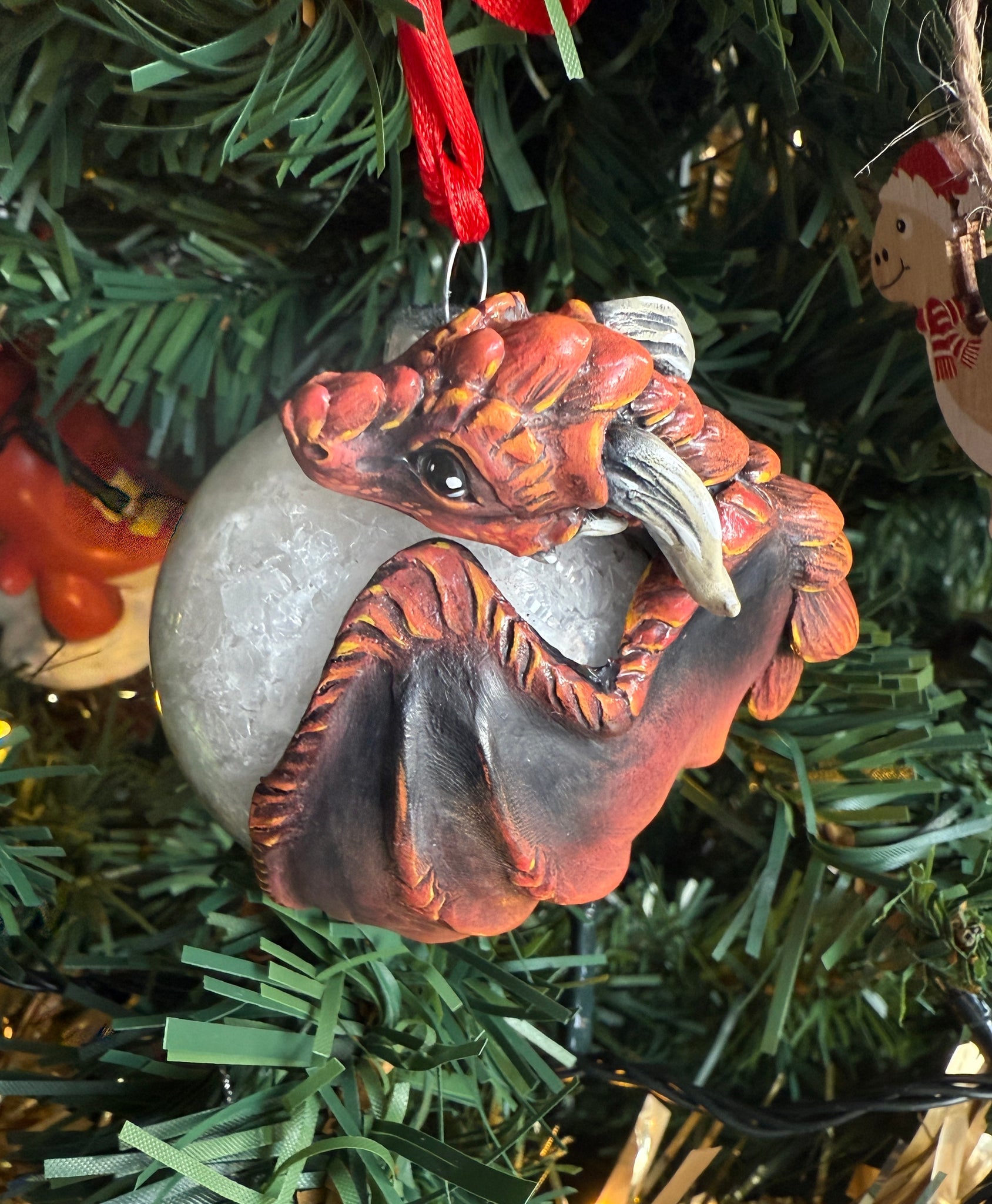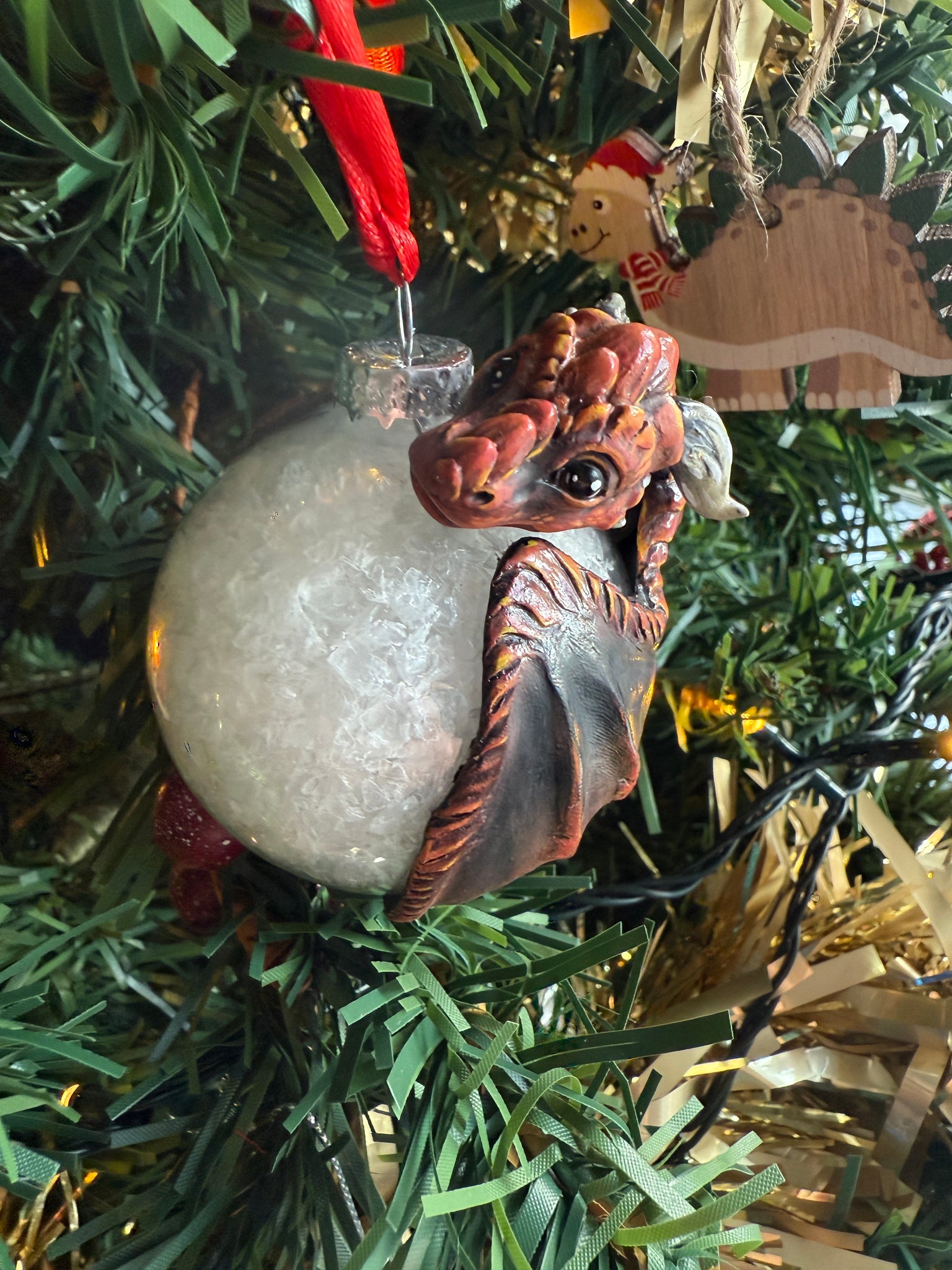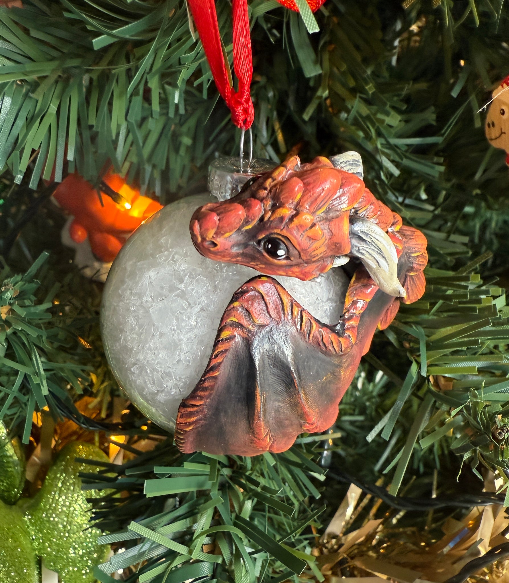 A dragon hand sculpted in polymer clay around a glass bauble that is filled with fluffy fake snow. He is hand painted to create a one of a kind ornament.
